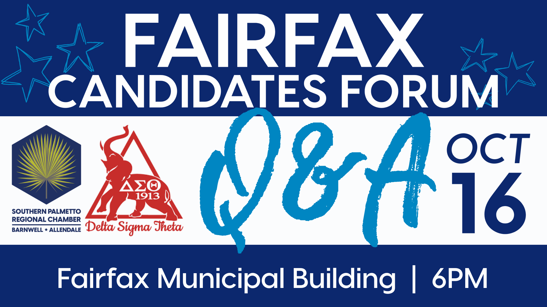 Fairfax Municipal Building 537 Allendale-Fairfax Hwy, Fairfax, South Carolina, United StatesDelta Sigma Theta Walterboro Alumnae Chapter & Southern Palmetto Regional Chamber Present the Fairfax Candidates Forum Join us for a candid Q&A with Fairfax's candidates to hear directly from the people who want to represent you. PLEASE NOTE: Questions will NOT be taken from the floor. All questions must be submitted prior to the event […]