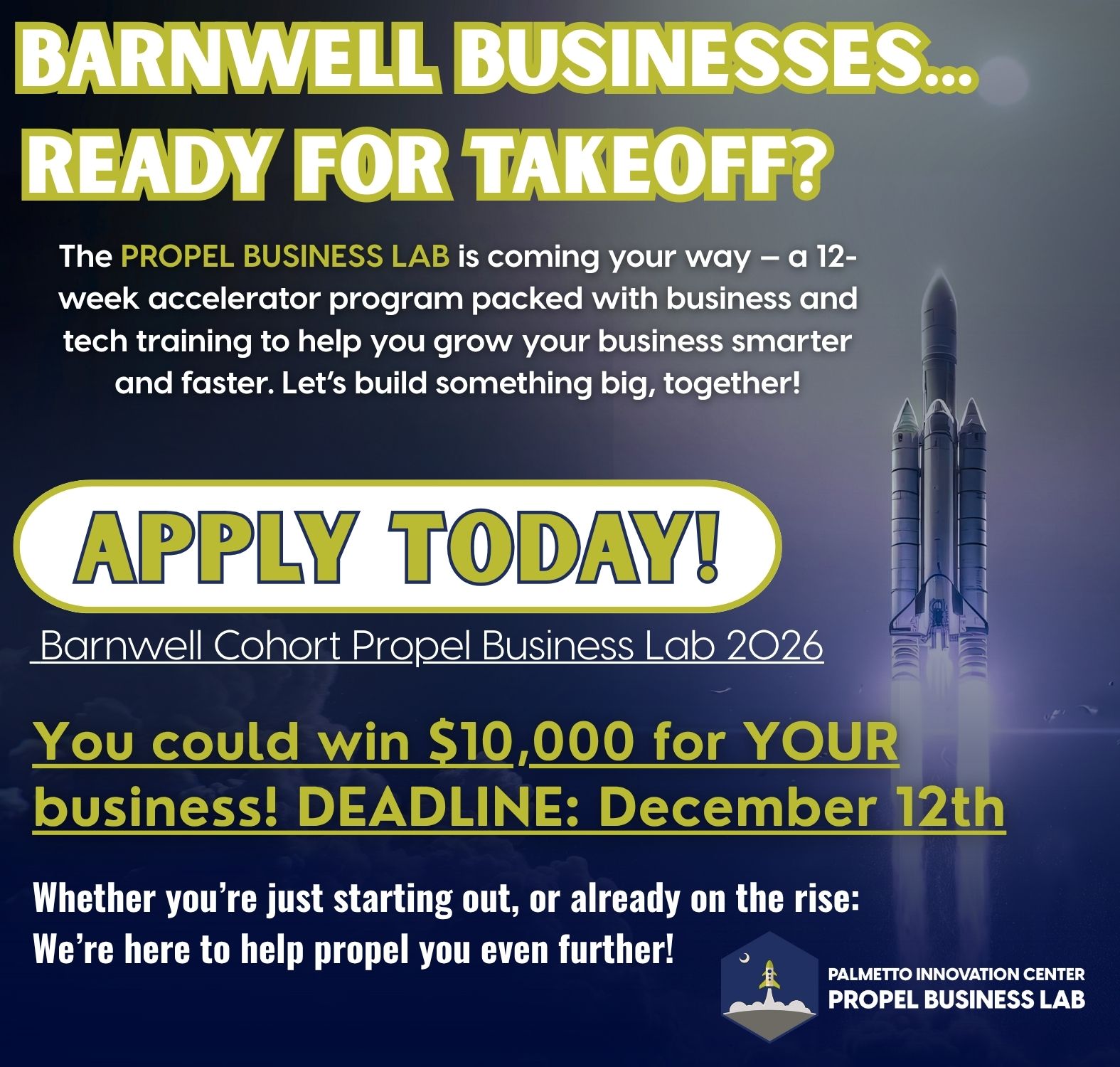 Palmetto Innovation Center 218 Main Street, Barnwell, SC, United StatesThe Propel Business Lab is coming your way. A 12-week accelerator program packed with business and tech training to help you grow your business smarter and faster. Let’s build something big, together! Deadline to apply is December 12th. Click here to apply: Propel Business Lab