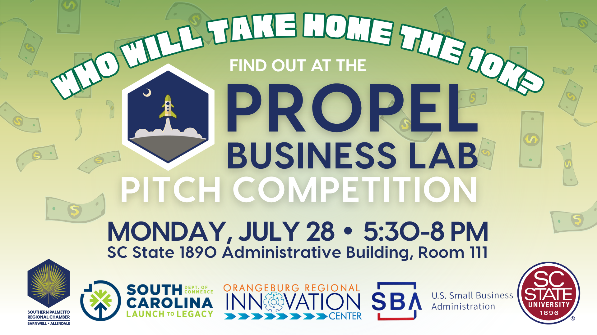 SC State 1890 Administrative Building, Room 111 300 College Ave, Orangeburg, South Carolina, United StatesAfter completing an intensive twelve-week program through the Propel Business Lab, a new group of local entrepreneurs is ready to take the stage. Join us for the Propel Business Lab Pitch Competition as participants present their business ideas to a panel of judges for a chance to win $10,000 to grow or launch their venture. […]
