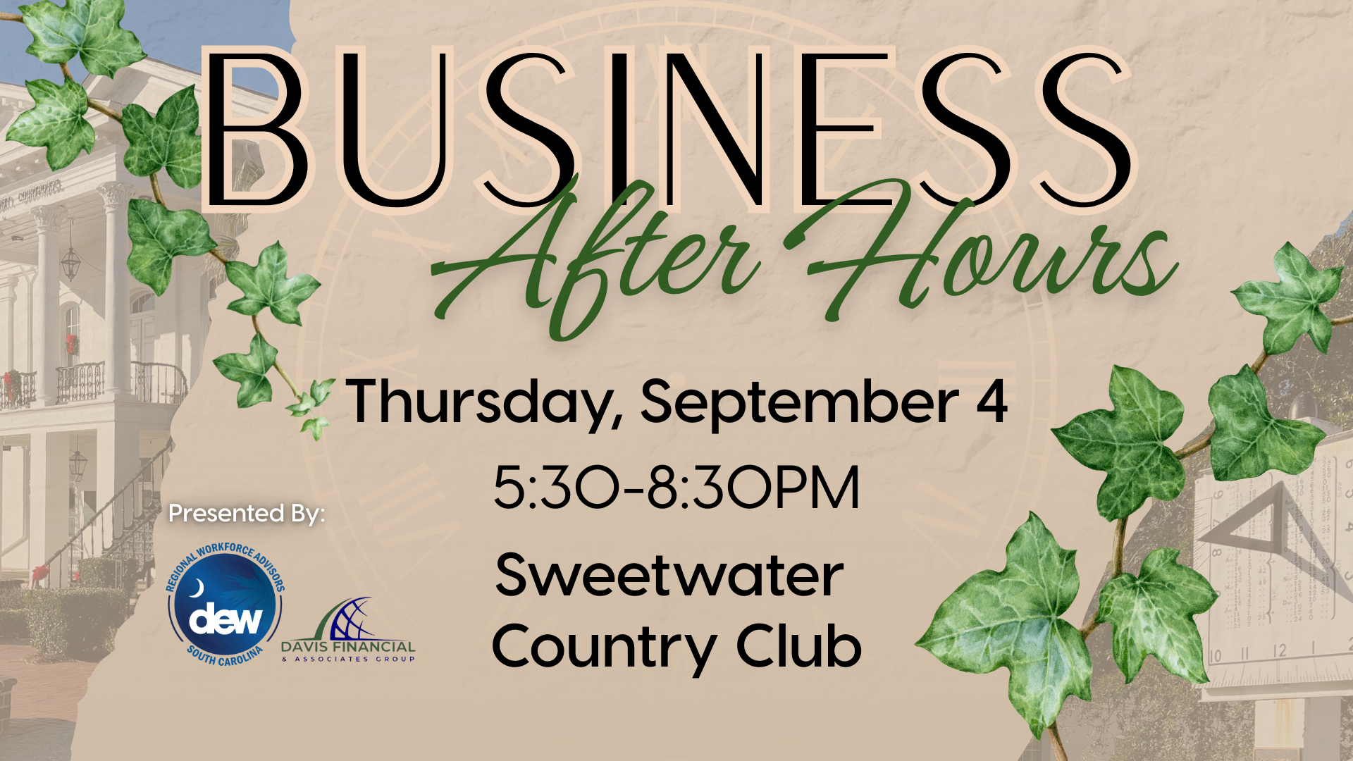 Sweetwater Country Club 571 Johnny George Ln, Banrwell, South Carolina, United StatesBusiness After Hours is BACK! Join us September 4 at Sweetwater Country Club for a laid back evening of networking. It’s the perfect excuse to get together with friends, neighbors, and fellow business folks. You’ll see familiar faces, meet a few new ones, and enjoy an evening filled with light refreshments, good conversation, and plenty […]