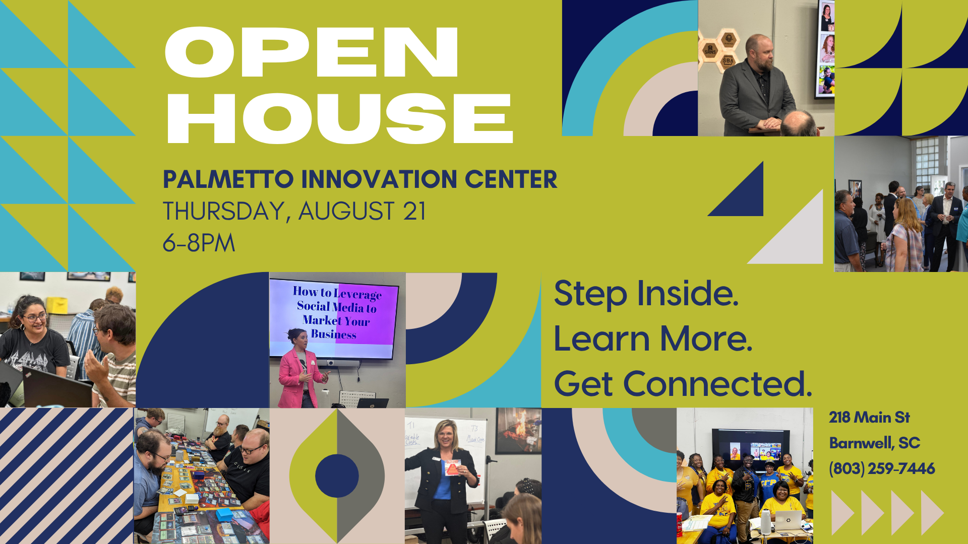 Palmetto Innovation Center 218 Main Street, Barnwell, SC, United StatesYou're Invited: Innovation Center Open House Join us for an Open House at the Innovation Center on Thursday, August 21 at 6:00 PM! We're opening our doors to the community for an evening of connection, conversation, and discovery. Come meet Camary, our new Innovation Center Coordinator, and get to know the rest of the team. […]