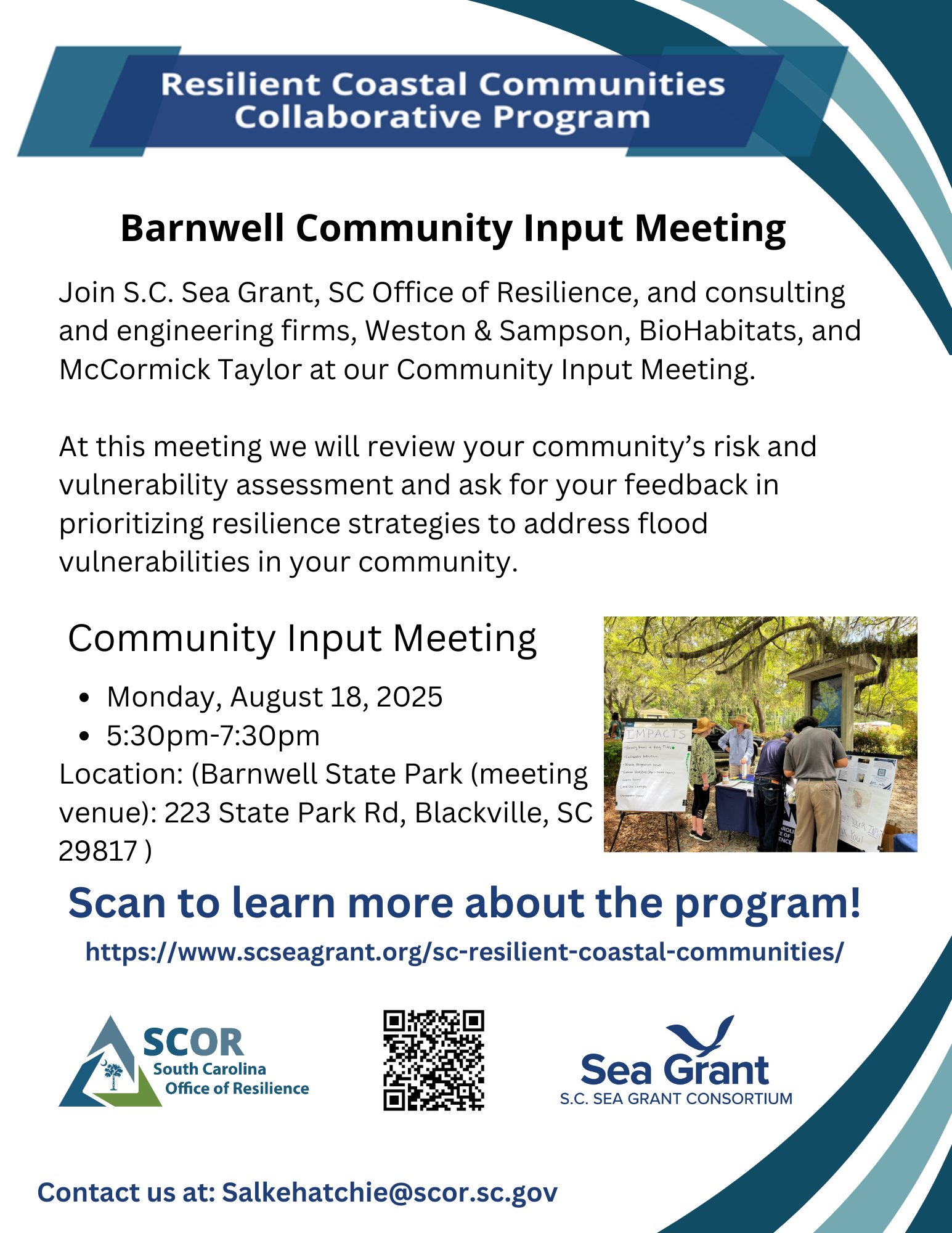 Barnwell State Park 223 State Park Rd, Blackville, South Carolina, United StatesJoin S.C. Sea Grant, SC Office of Resilience, and consulting and engineering firms, Weston & Sampson, BioHabitats, and McCormick Taylor at our Community Input Meeting. At this meeting we will review your community's risk and vulnerability assessment and ask for your feedback in prioritizing resilience strategies to address flood vulnerabilities in your community. Learn more […]